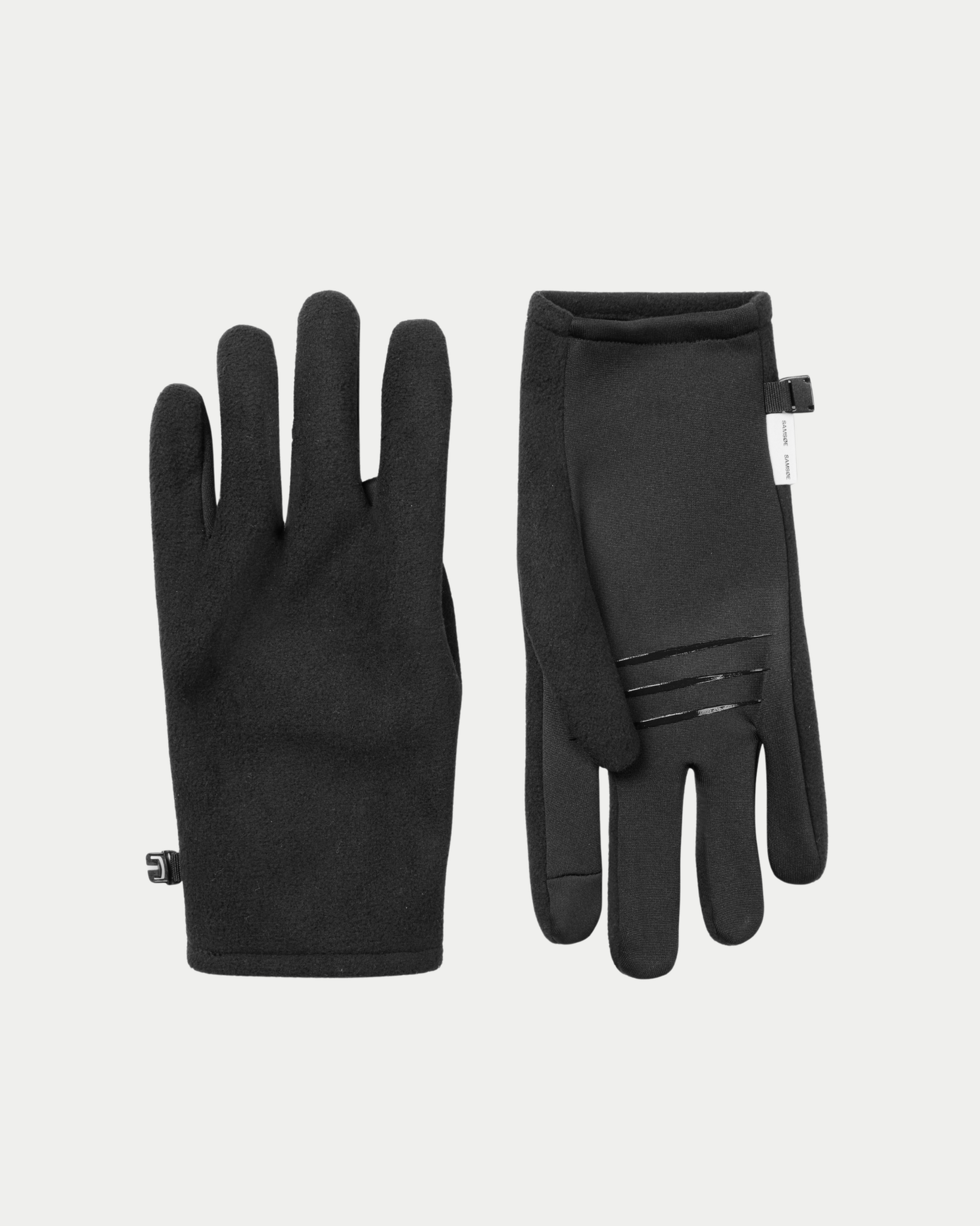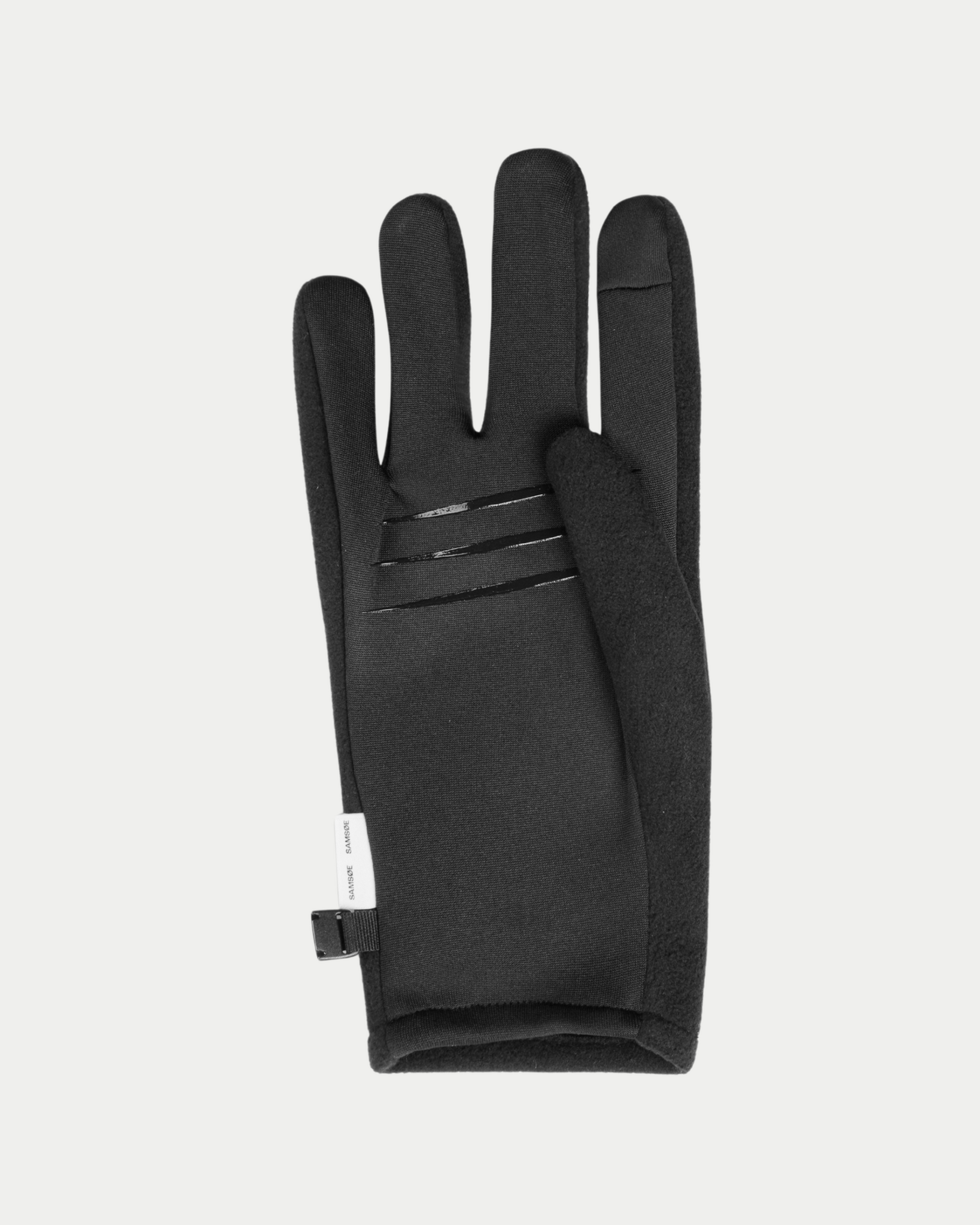 Technical gloves from Samsøe Samsoe with screen fingertips on the thumb and index finger, anti-slip details on the palm and a hook on the sides.