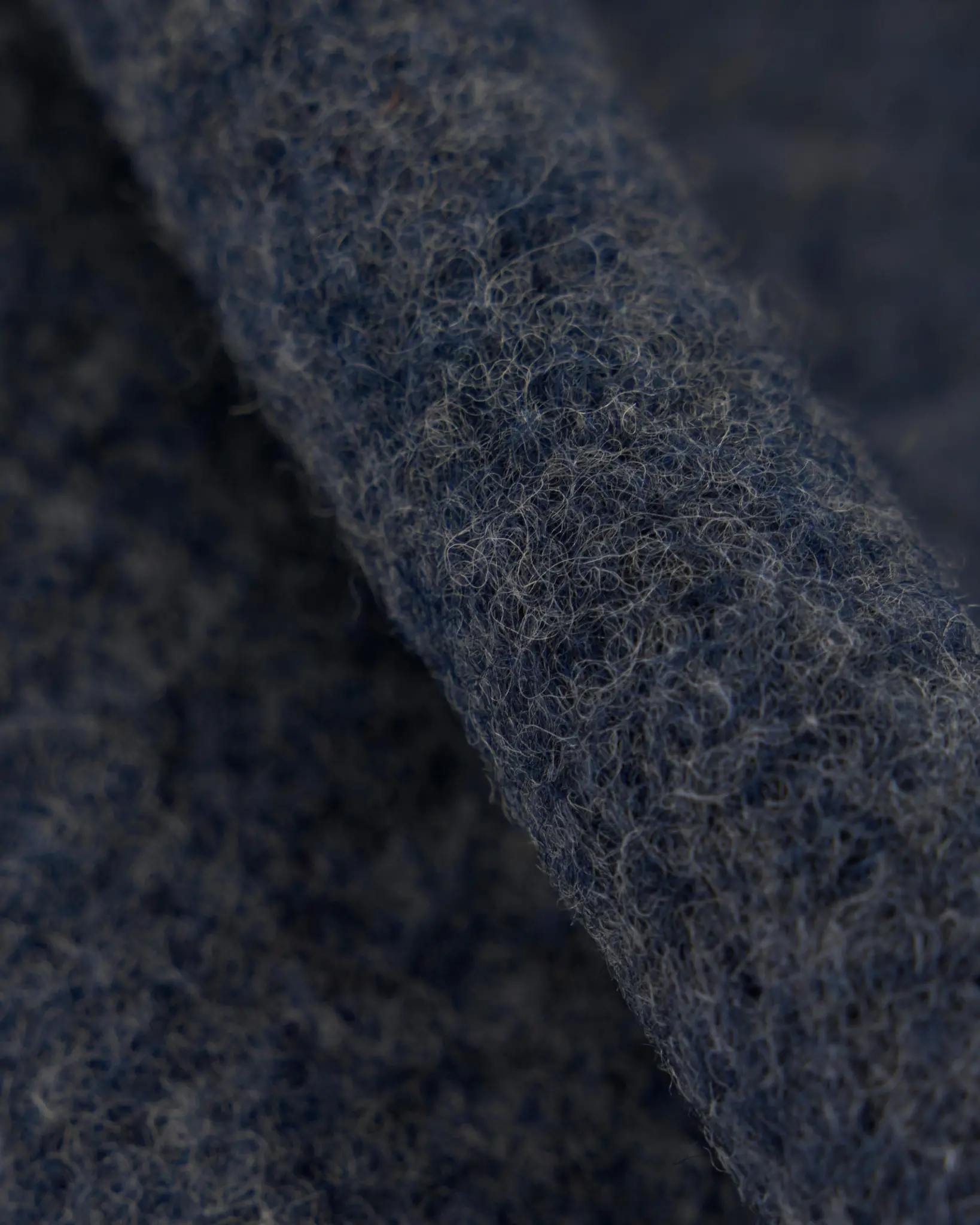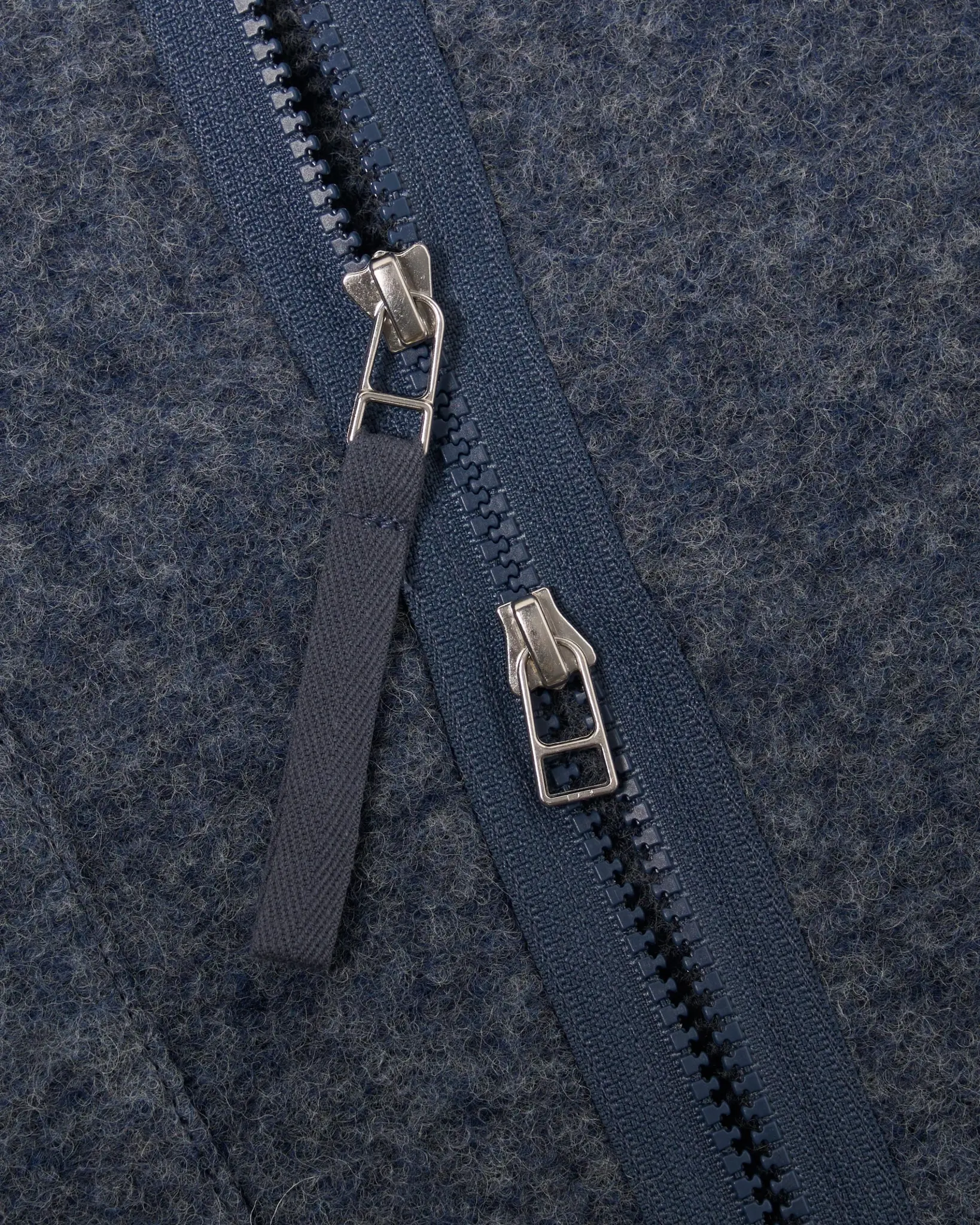 This slate blue Zip Liner made of wool fleece is a loose-fitting, felted workwear jacket. Unstructured, with a visible zip fastening and two patch pockets.