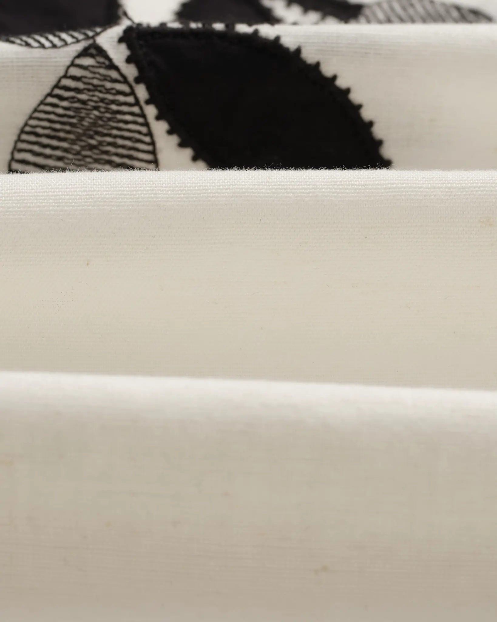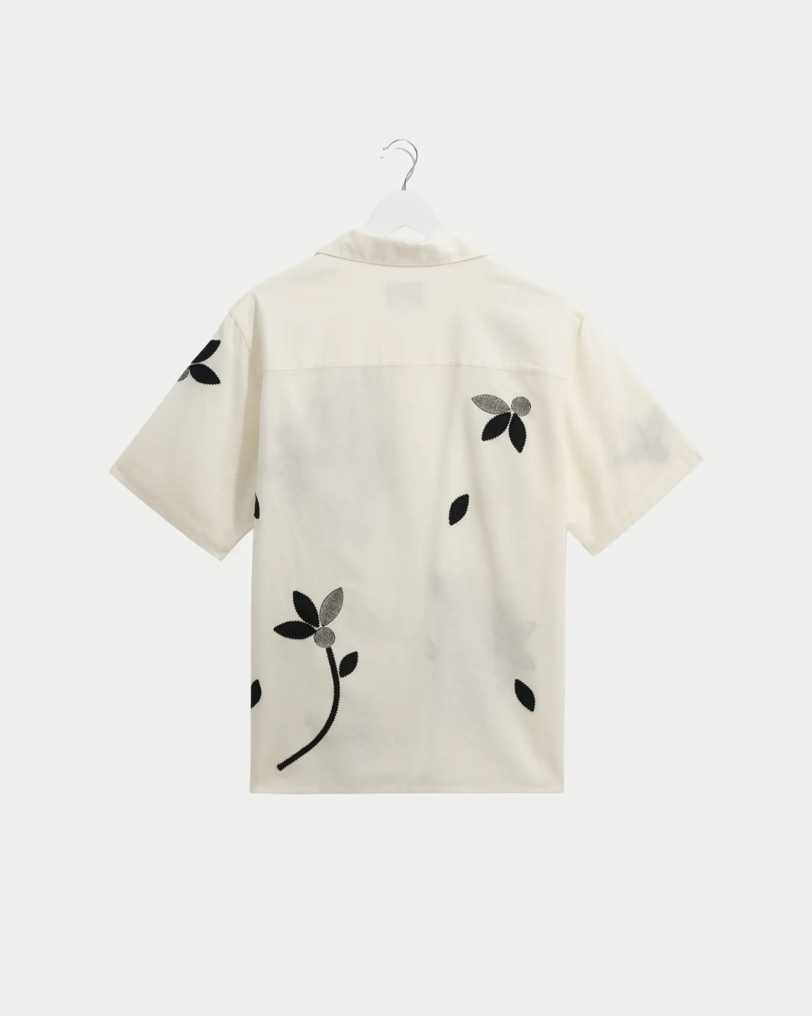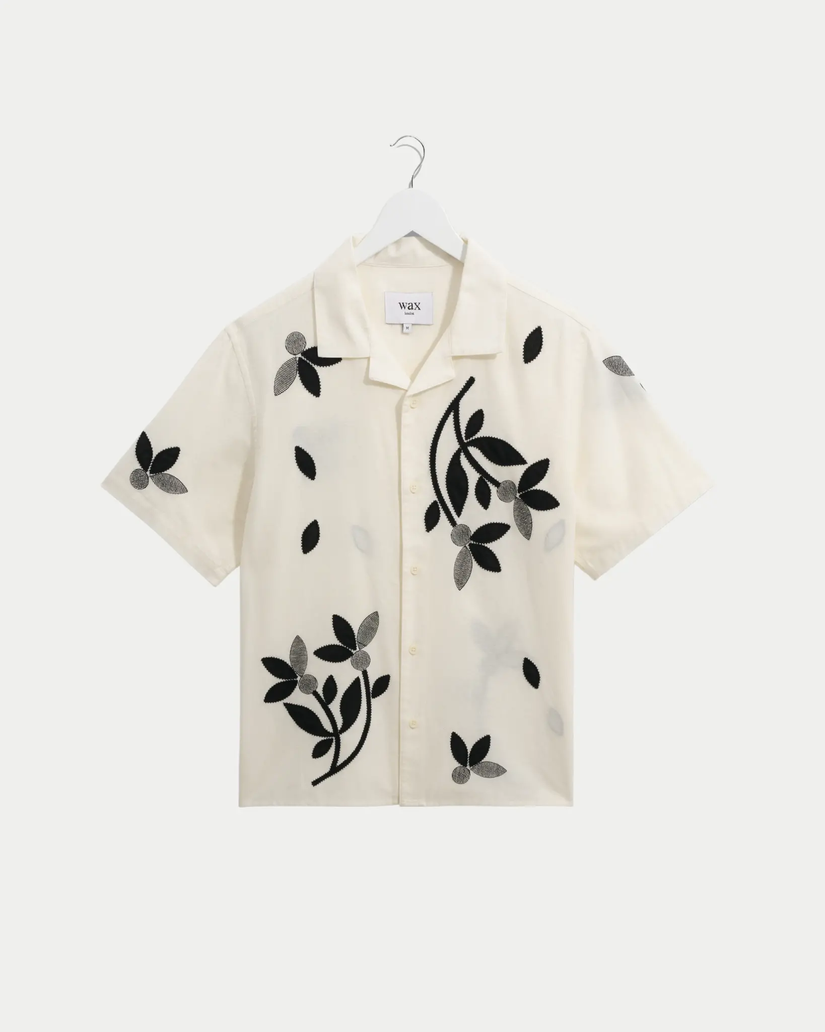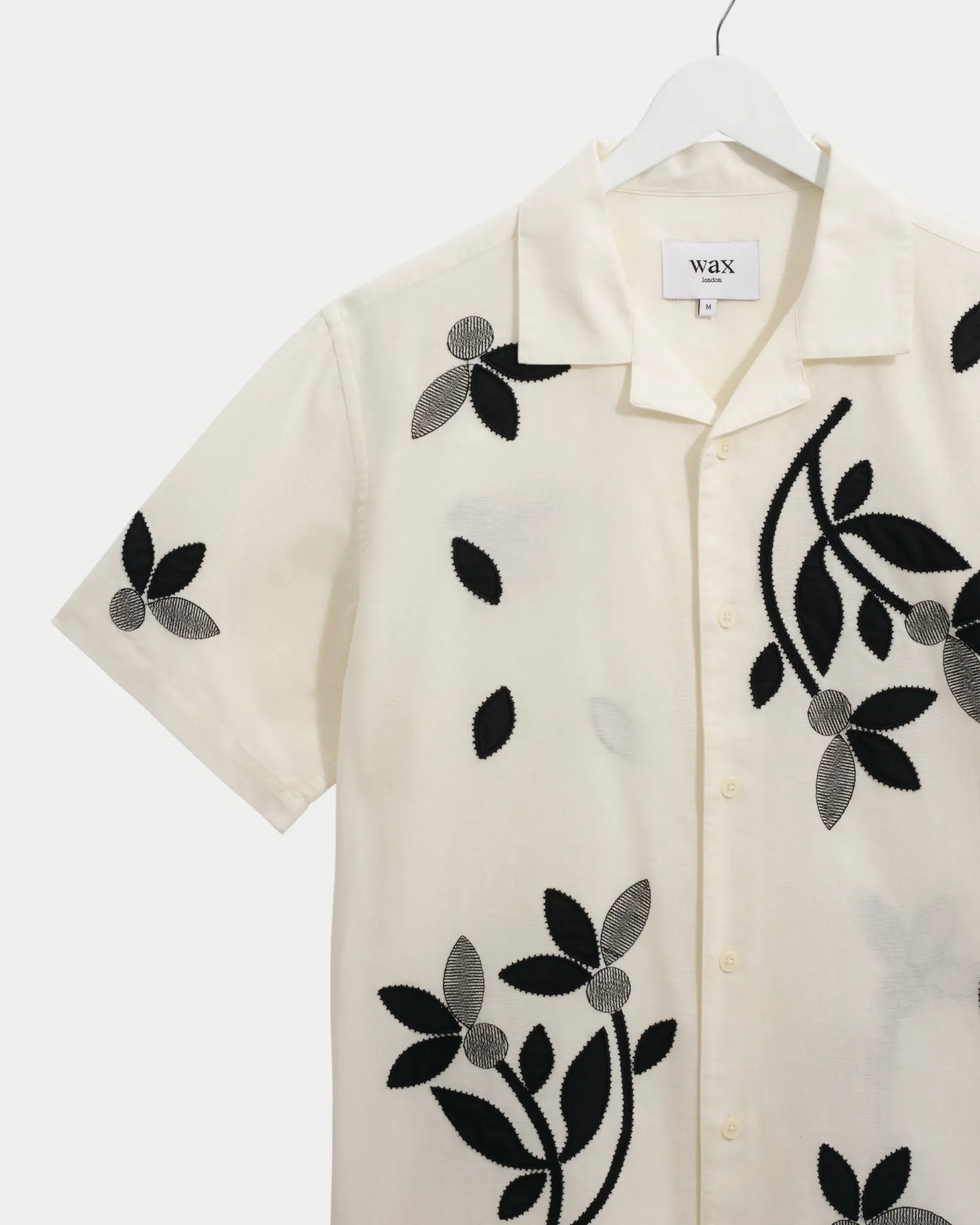 Didcot is the Wax London short-sleeved shirt. Made from a blend of cotton and linen, this Bloom Applique Ecru Black is decorated throughout with a black floral scene.