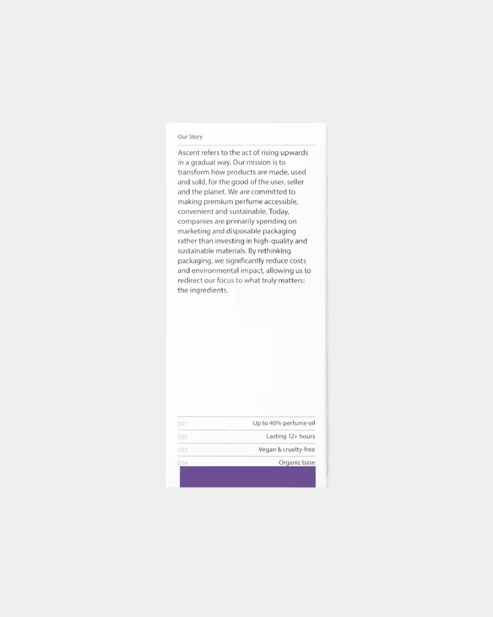 De navulling van Ascent Purple is los of in de handige case te gebruiken. Deze uniseks parfum combineert luchtige frisheid met warme muskus- en houtachtige noten, versterkt door een subtiele minerale helderheid.