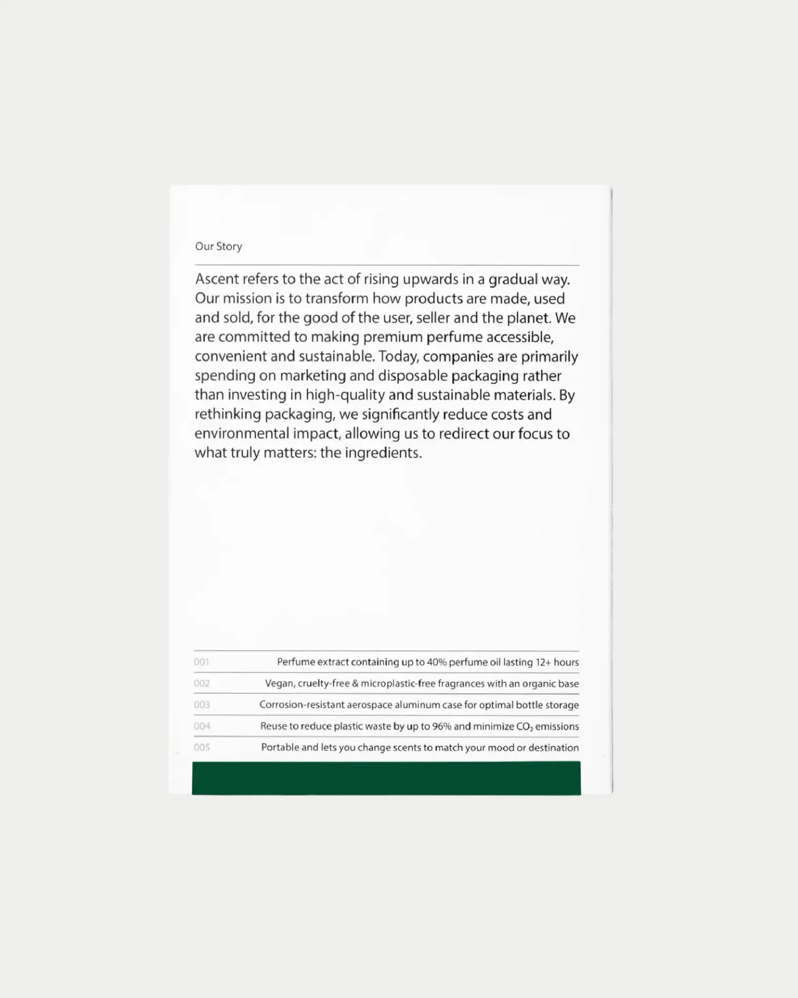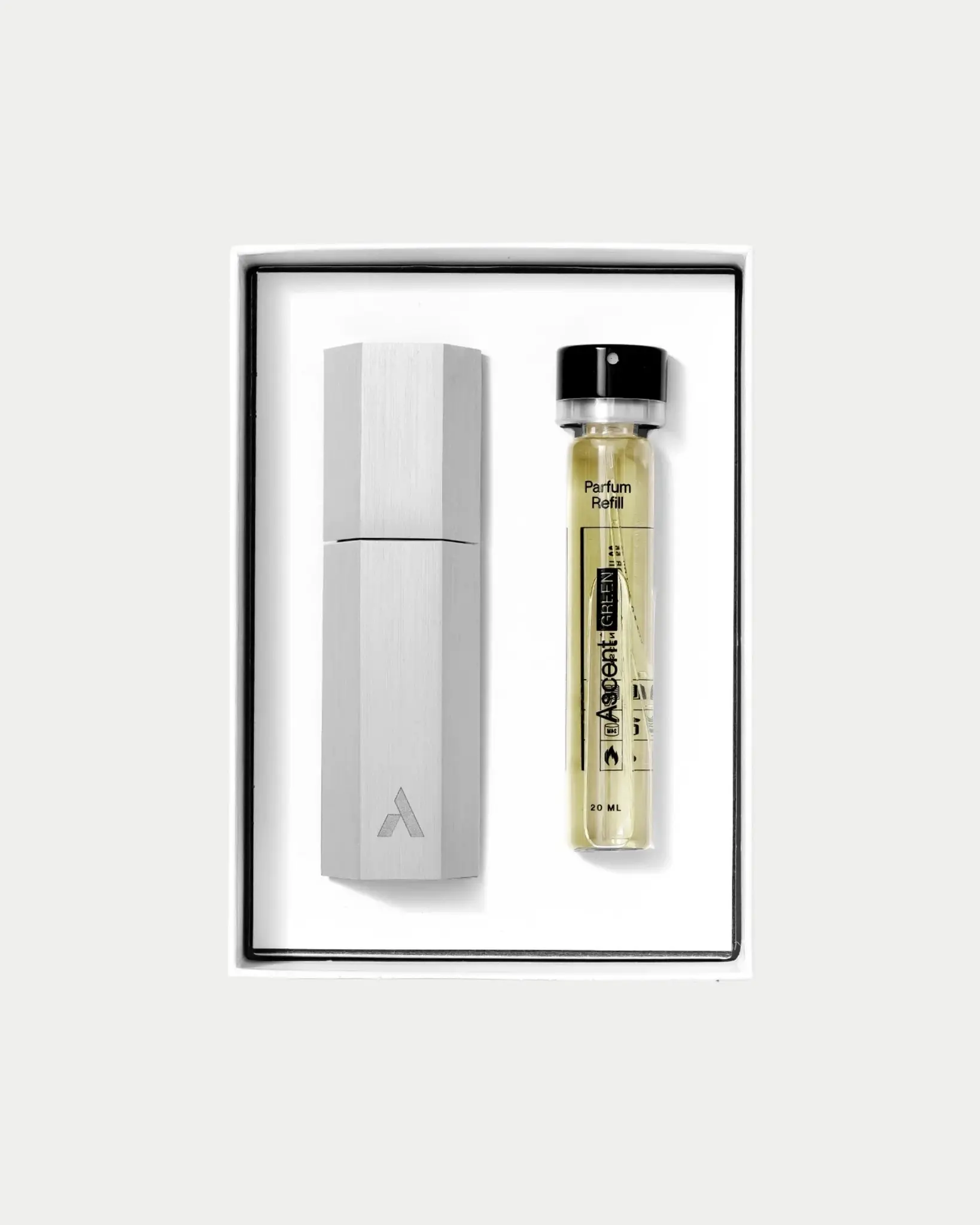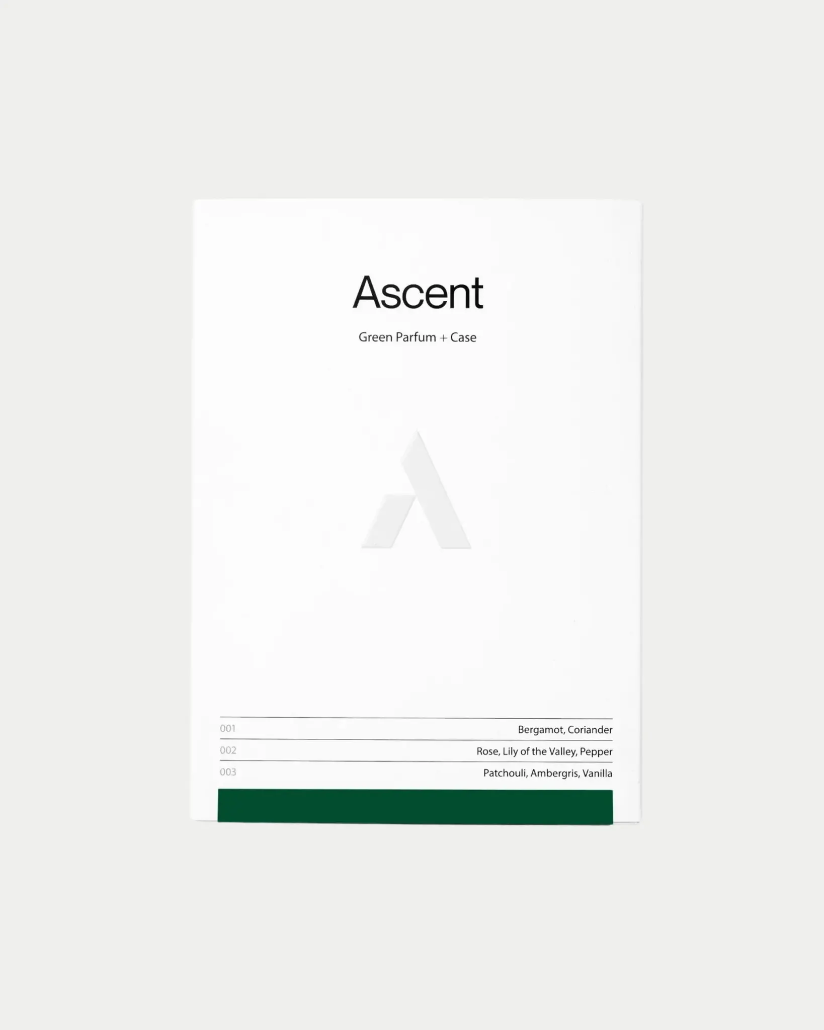 De Ascent Green Starterpack bevat een luxe case en 20ml flacon parfum. Deze uniseks parfum is elegant en intens, met kruidige invloeden en patchouli.