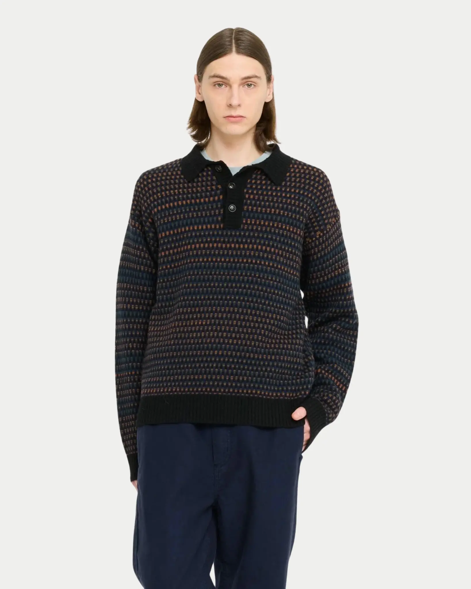 De Meryon Knit heeft een structuurpatroon met verschillende kleuren. Een contrasterende kraag en knoopsluiting geven extra detail aan deze comfortabele longsleeve polo trui.