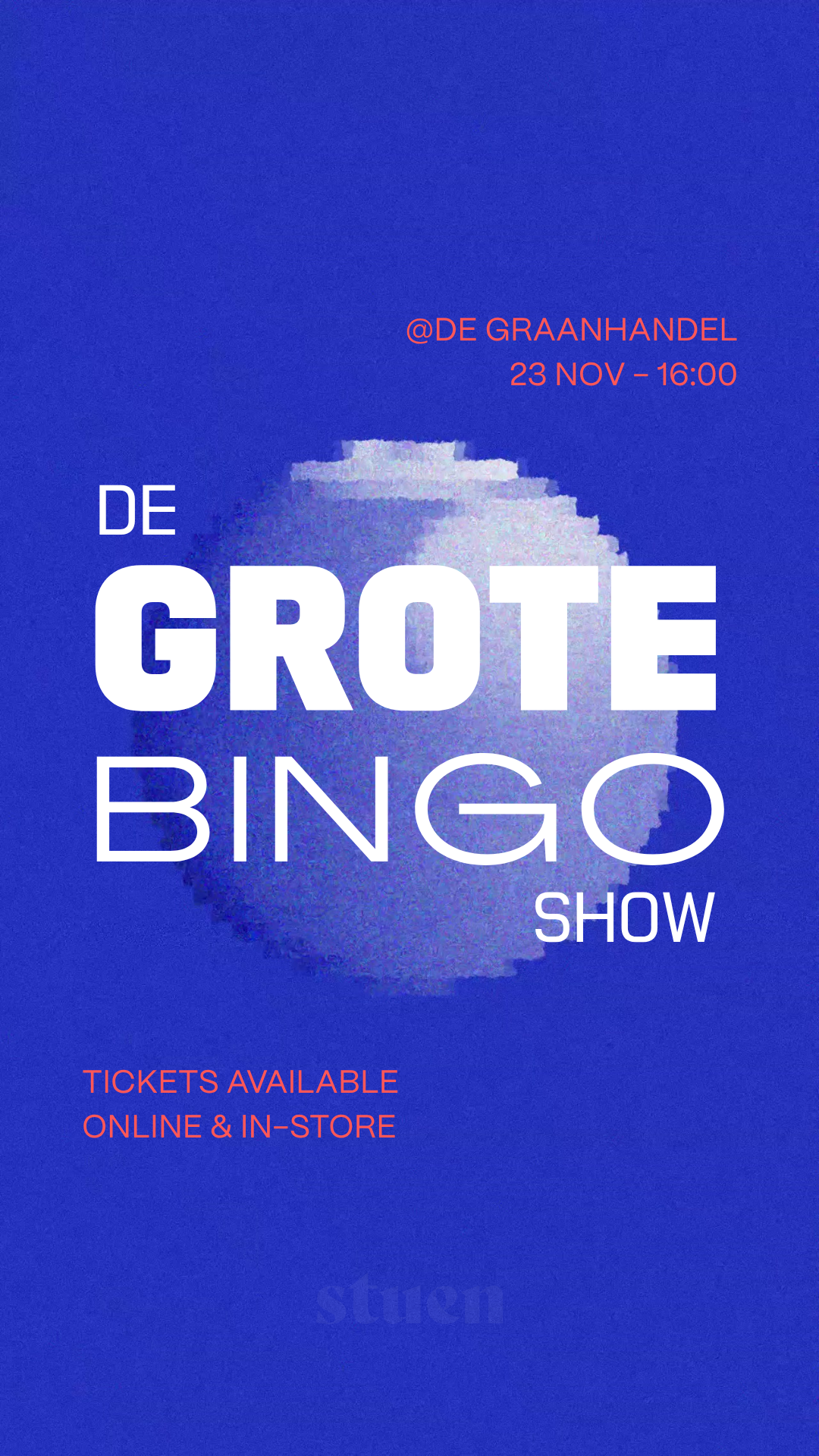 Zondag 23 november organiseert Stuen ‘De Grote Bingo Show’ met grote prijzen en nog grotere gezelligheid bij De Graanhandel. Dus trommel je vrienden op en pak die klappers van prijzen! De zaal gaat open om 16:00 uur en de balletjes rollen om 16:30 uur.