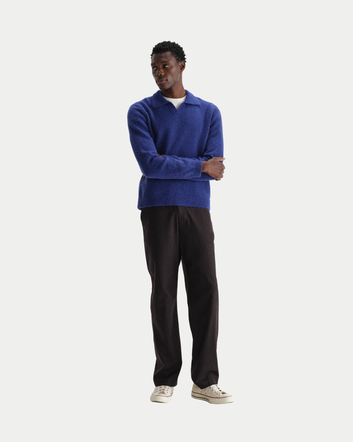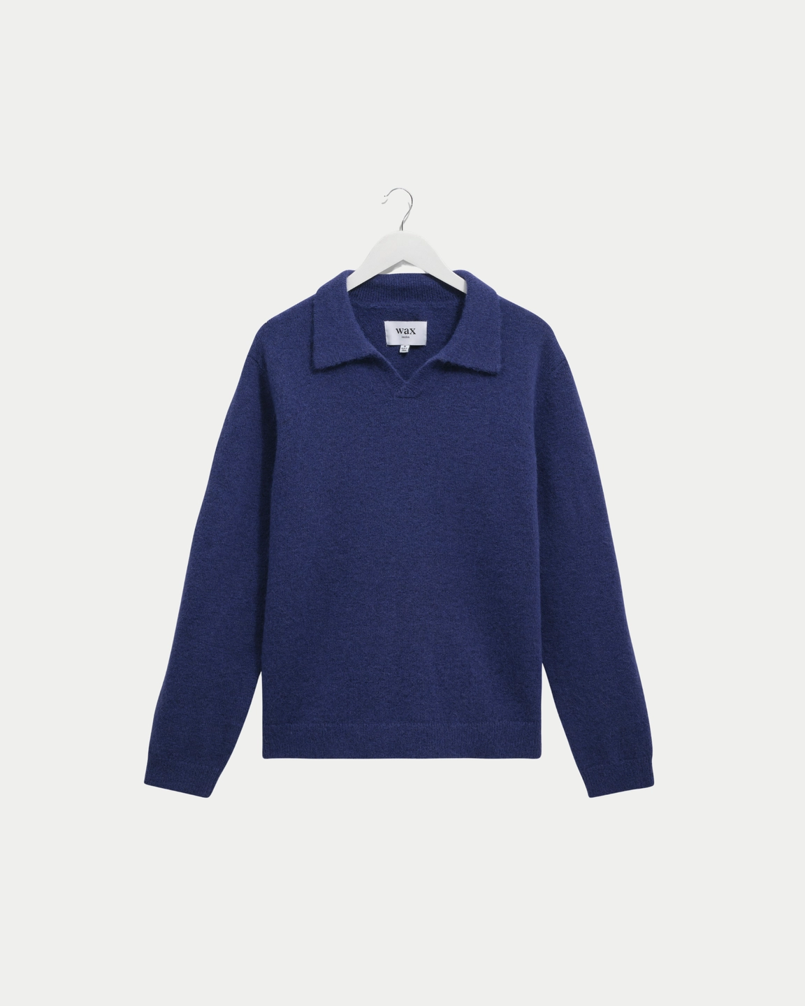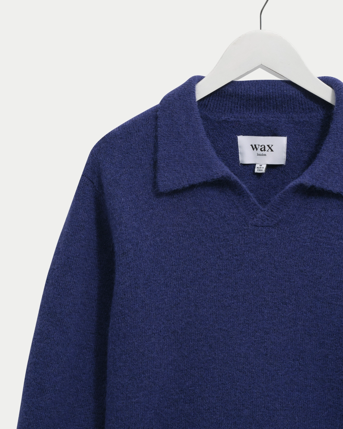 De Carter van Wax London is een opvallende blauwe polo met lange mouwen en open kraag. Door de relaxte pasvorm en wol-mohairmix heeft de trui een donzige textuur.